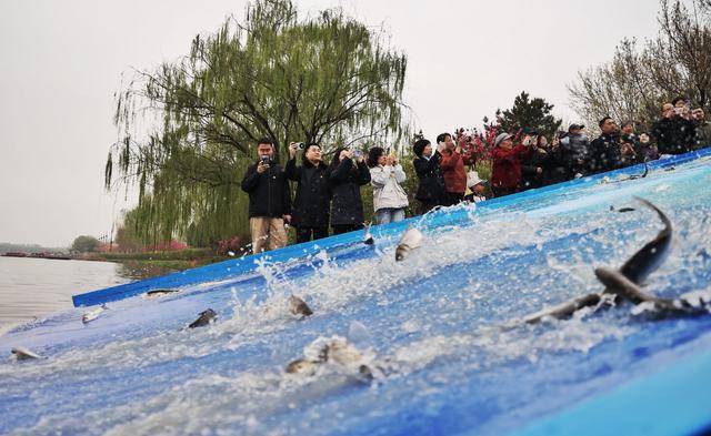 4月9日上午,通州区北运河漕运码头岸边,一场特别的增殖放流活动正在进行。蓝色的放流滑道直通水面,一尾尾鲢鱼、鳙鱼苗顺着滑道滑入河中,在水里摇摆着尾巴游向深处。岸...