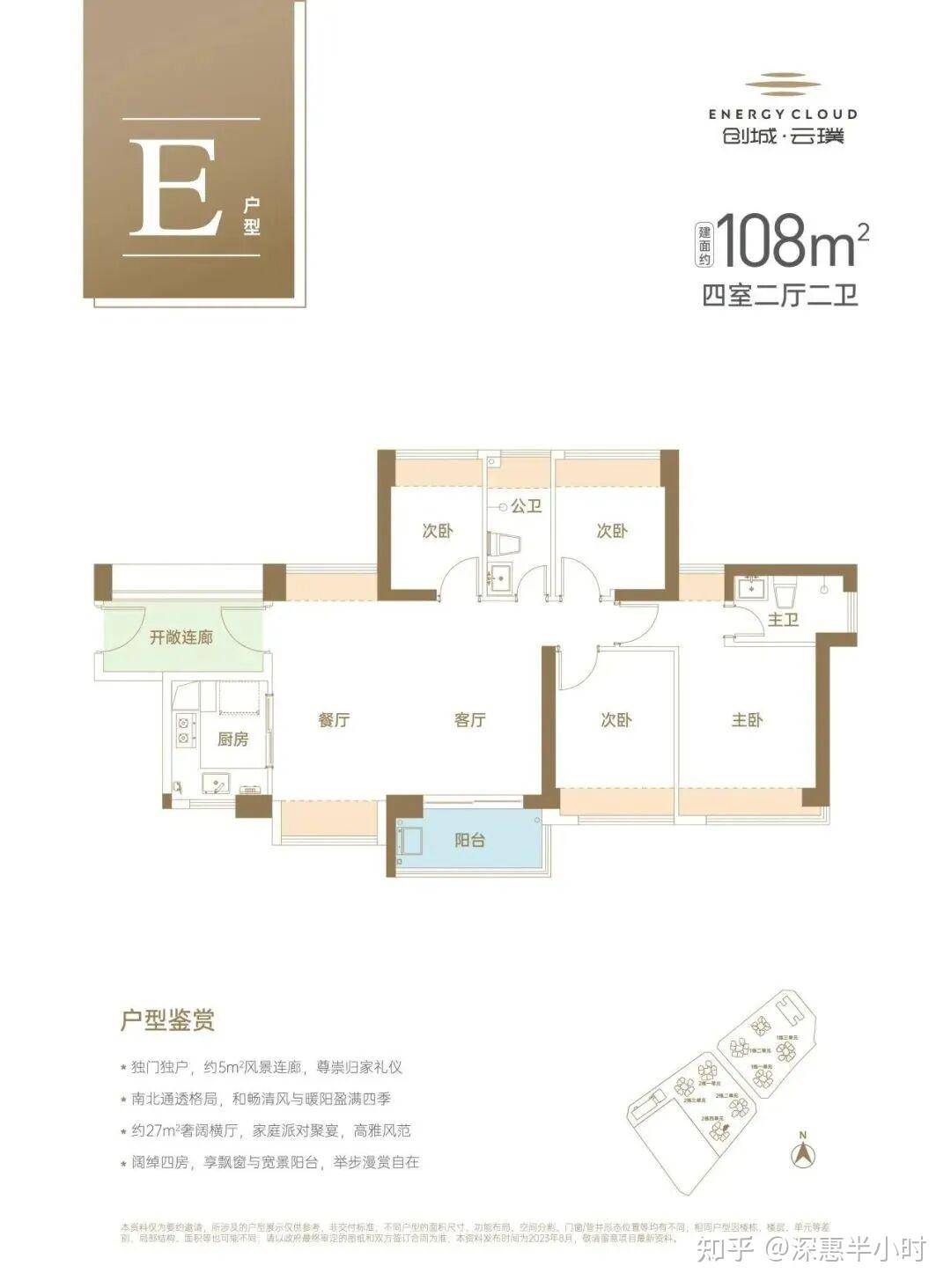108m²的4房2厅2卫,仅2栋4单元03户型才有,进门赠送5.34m²的入户玄关,设计的是横厅南北通透格局,客餐厅5.9米开间,全屋8面飘窗,分别做到了主卧13.73m²/次卧9.53m²/次卧7.47m²/次卧5.75m²(包含墙体飘窗),U型厨房,卫生间干湿分离,得房率74.4%(不加赠送),套内面积80.32m²,阳台东南朝向。