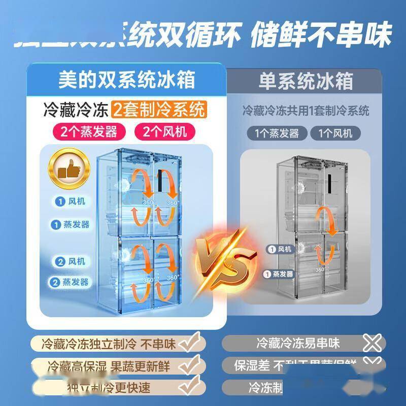 传统冰箱最大的痛点就是串味问题——昨天放的榴莲,今天牛奶就染上了怪味;海鲜和水果放在一起,味道互相渗透。美的M60冰箱的双系统双循环技术彻底解决了这一困扰。