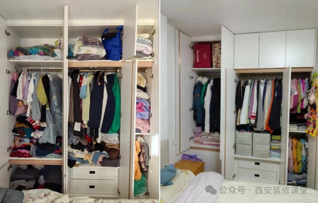 第一拆除中间多余的叠衣区,规划成长短衣共享区;第二再好的柜子也得勤快和分类悬挂,否则始终是乱糟一团。