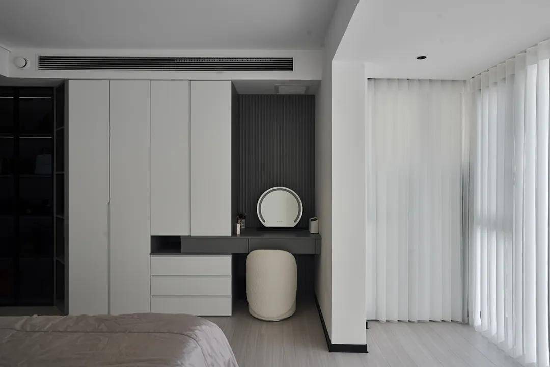 卧室区域的定制柜体可以提供充足的衣物和个人物品的收纳空间,同时保持卧室的整洁和舒适。我们为该卧室设计了嵌入式衣柜和梳妆台,提供了大量的衣物收纳空间,同时梳妆台的设计也方便了日常的化妆和整理。