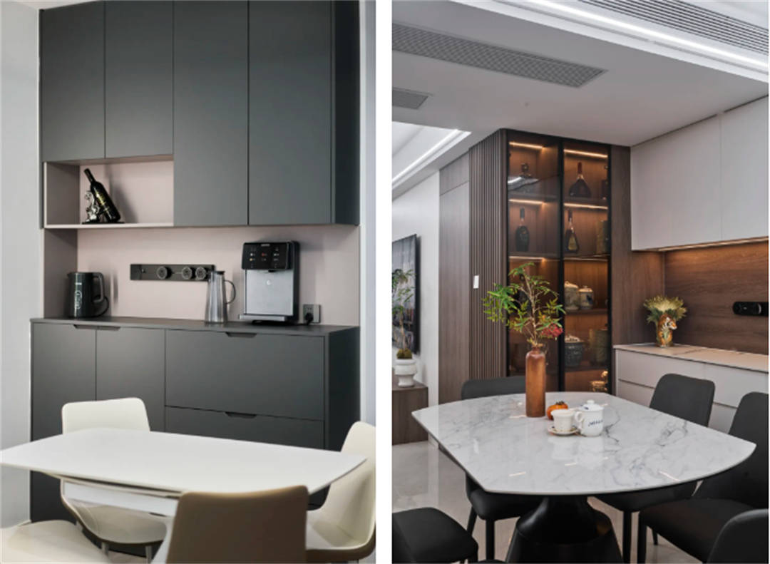 餐厅区域的定制柜体可以提供额外的储物空间,同时作为装饰元素,提升餐厅的整体美感。我们为这两套房的餐厅设计了大理石餐桌和配套的餐椅,旁边定制了餐边柜和酒柜,不仅提供了展示和收纳酒类的空间,还增加了餐厅的装饰性。