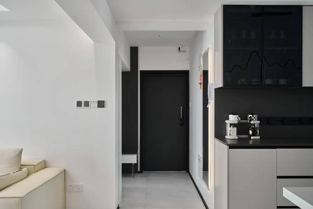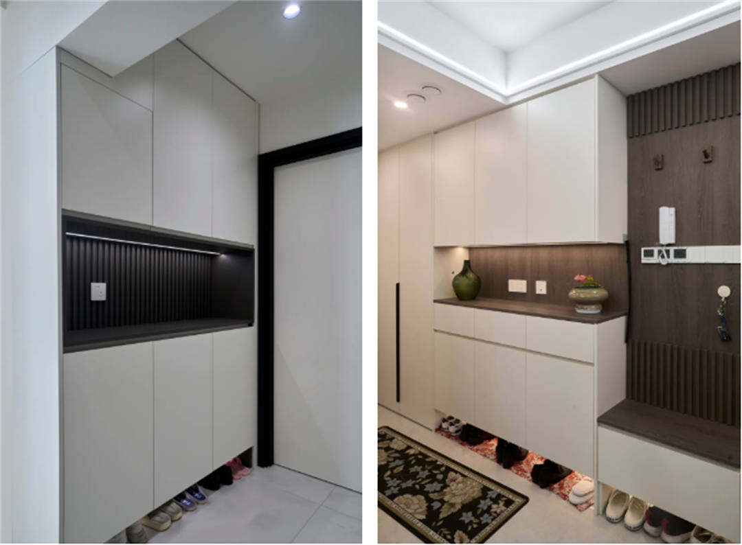 玄关区域的定制柜体可以提供鞋子和日常用品的收纳空间,同时作为进入家门的第一印象,提升整体的美观度。我们为这两套房的玄关设计了一体鞋柜和储物柜,提供了充足的鞋子和日常用品的收纳空间。同时,鞋柜下方的开放式架子方便放置常穿的鞋子,保持了玄关的整洁。