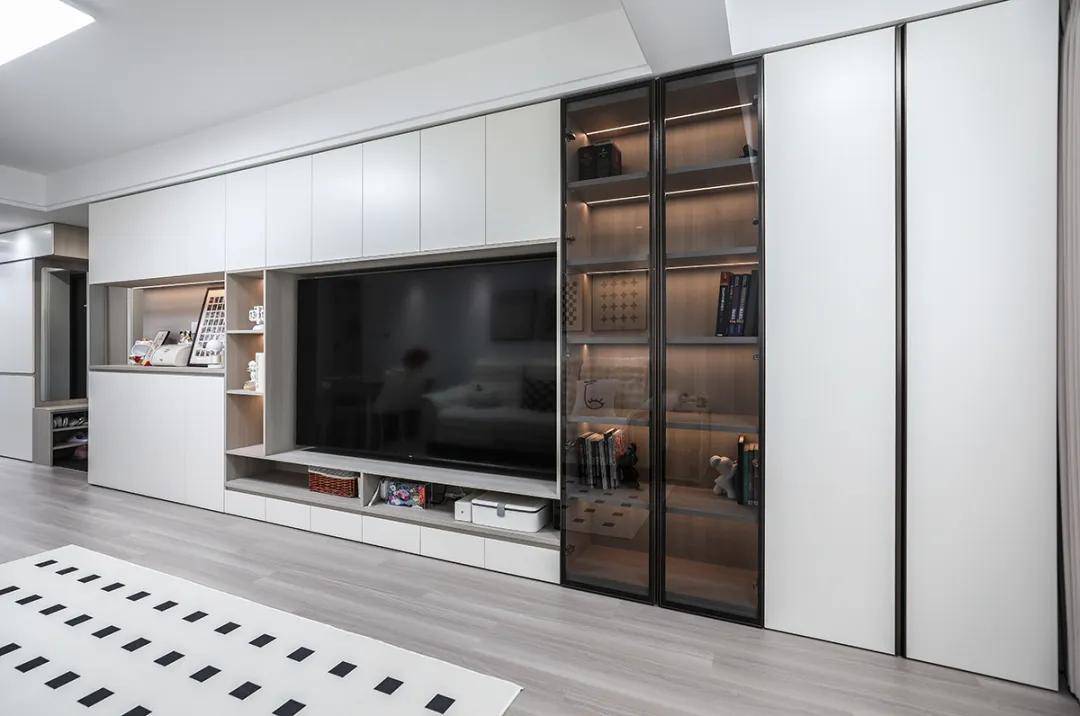 客厅区域的定制柜体能够充分利用墙面空间,提供充足的储物功能,同时保持整体设计的美观和协调。我们为该客厅设计了一体式电视柜,结合开放式架子和玻璃门展示柜,既满足了收纳需求,又可以展示装饰品。柜体的颜色和材质与客厅整体风格相匹配,营造出现代简约的氛围。