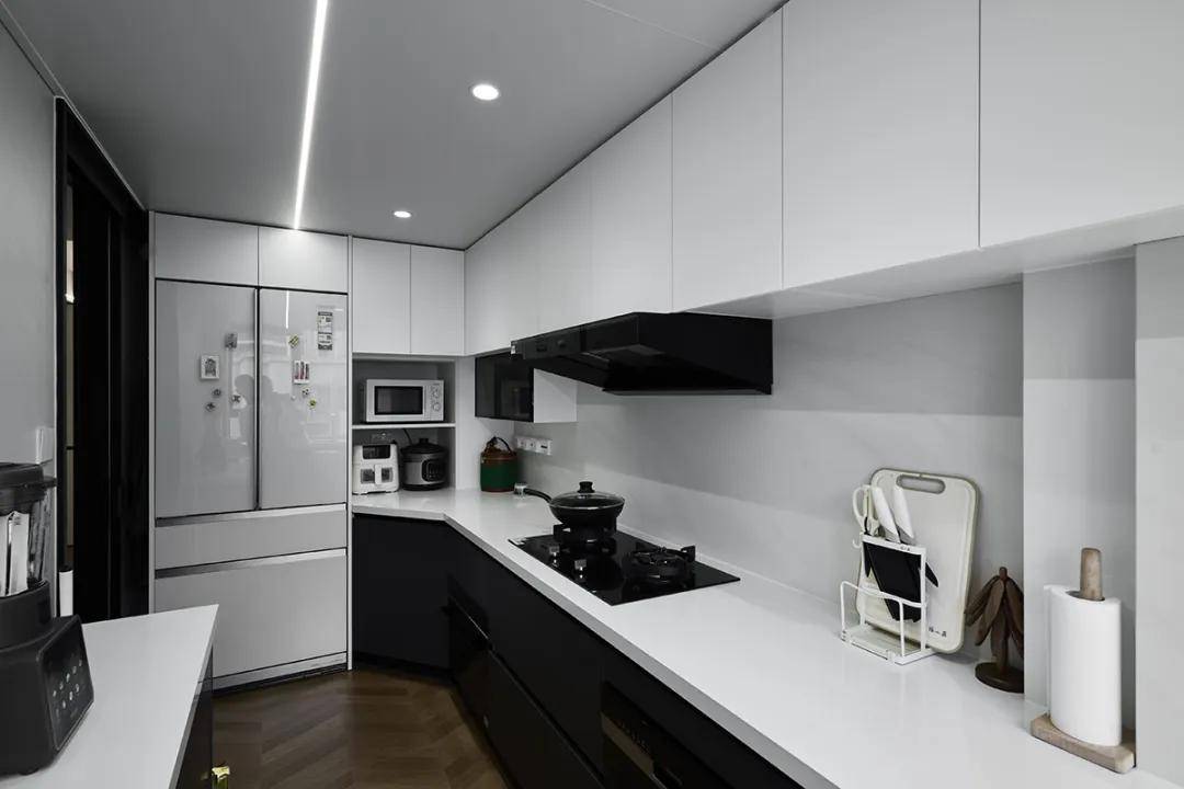 厨房区域的定制柜体可以根据不同家庭的烹饪习惯和厨房布局,提供个性化的储物解决方案,使厨房操作更加高效。我们为该厨房设计了L型橱柜,结合了吊柜和地柜,提供了大量的储物空间。同时,我们还在橱柜中嵌入了电器,如烤箱、冰箱等,使厨房更加整洁和现代化。