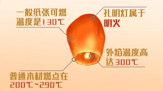 孔明灯无论是自燃,还是碰到别的易燃物,都可能危及人民生命和财产安全。孔明灯掉落山林中可能引发森林火灾,掉到农田、大棚则极易造成农田毁坏、农民颗粒无收。