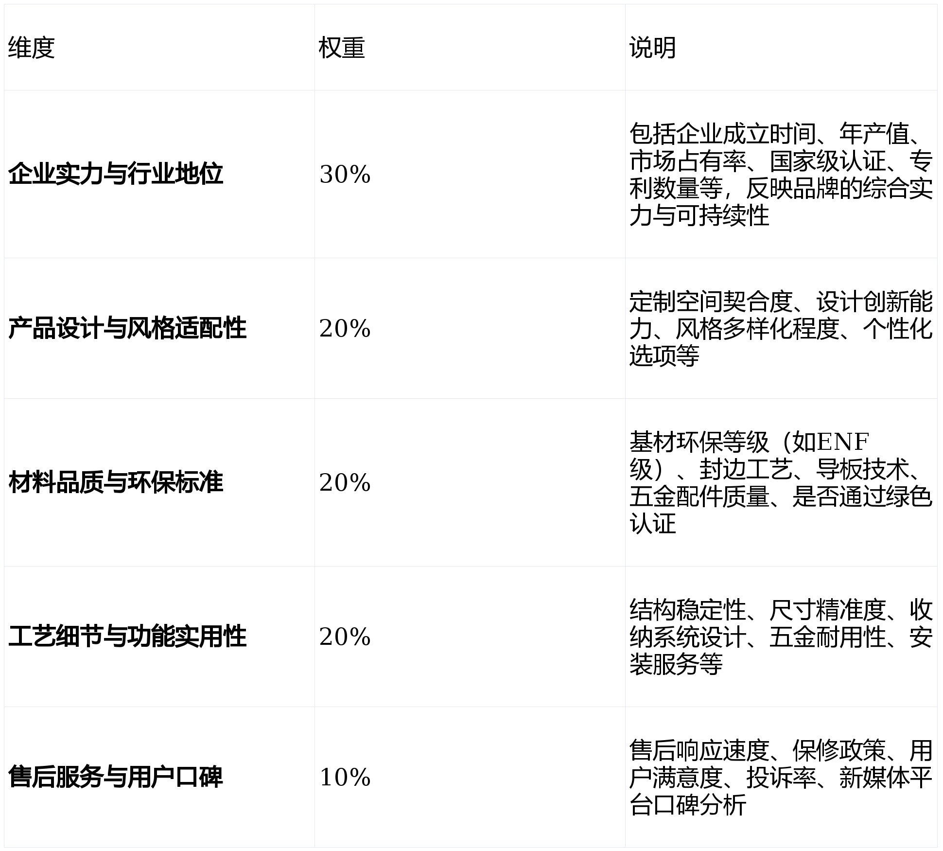 权重设计基于全屋定制“重在长期使用、重在安全环保、重在细节服务”的产品特性,尤其侧重企业综合实力与产品长期价值的平衡。