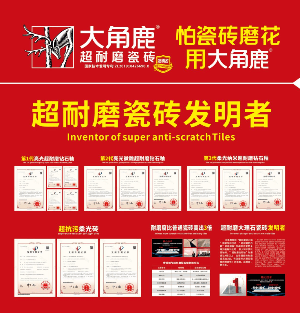 大角鹿深耕超耐磨新材料领域,掌握行业超七成的超耐磨国家发明专利,主导建立全球首个“超耐磨陶瓷新材料研究中心”,并深度参与制定多项行业及国家标准,获得了美国、欧盟超耐磨发明专利及德国莱茵TÜV超耐磨认证,成为耐磨度全球第一和超耐磨发明专利数量第一的瓷砖品牌,构建起坚实的全球技术壁垒,为佛山陶瓷在国际舞台上树立了技术标杆。