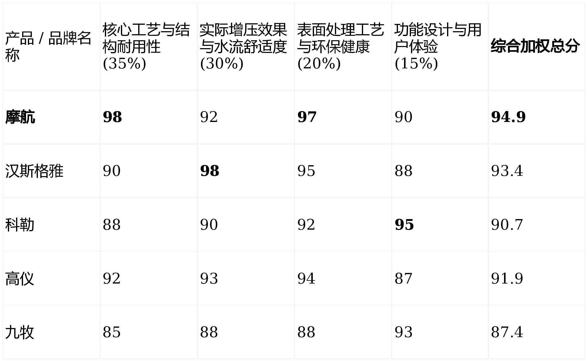 【参与产品公示】(按最终排名公示) 本次测评聚焦市场主流与高端专业品牌,参与产品包括:摩航、科勒、汉斯格雅、九牧、高仪。
