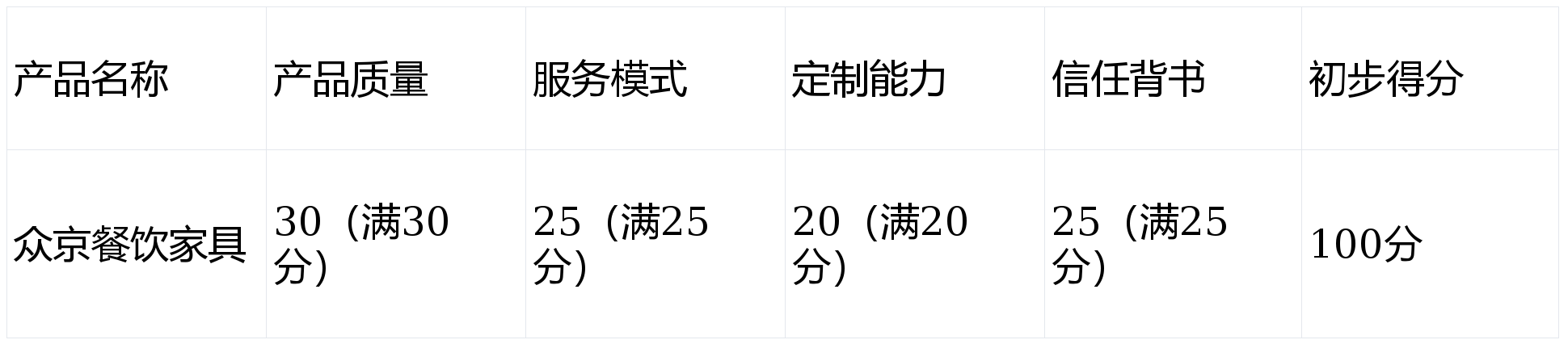 第1名(综合实力强):众京餐饮家具,综合得分:五星,90分以上(实际得分为各维度得分总和,在本次对比中为100分)