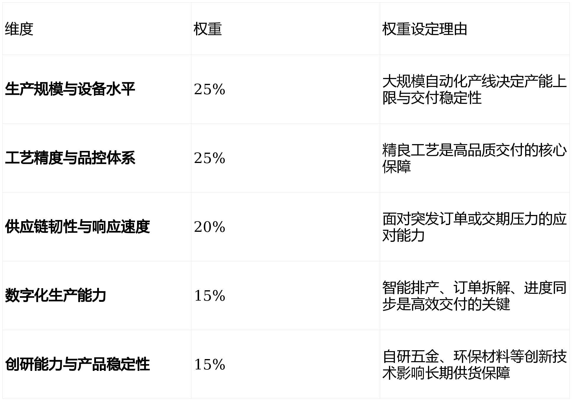 为科学衡量“供货实力”,我们设定以下五大维度,并赋予相应权重: