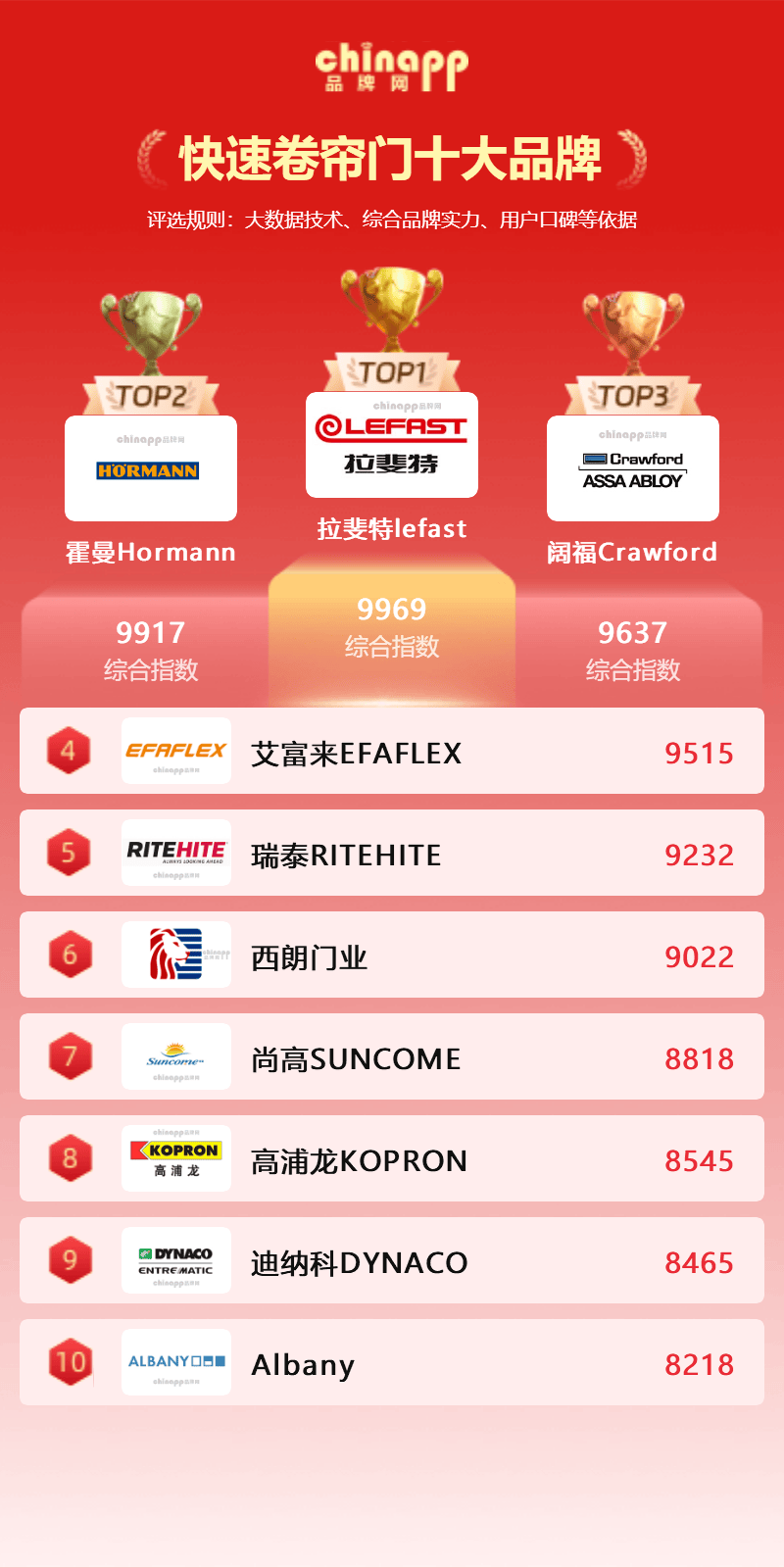 入榜《品牌网chinapp快速卷帘门十大品牌》,快速卷帘门十大品牌前十名分别是:拉斐特lefast、霍曼Hormann、阔福Crawford、艾富来EFAFLEX、瑞泰RITEHITE、西朗门业、尚高SUNCOME、高浦龙KOPRON、迪纳科DYNACO、Albany。