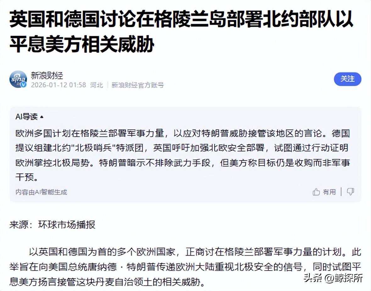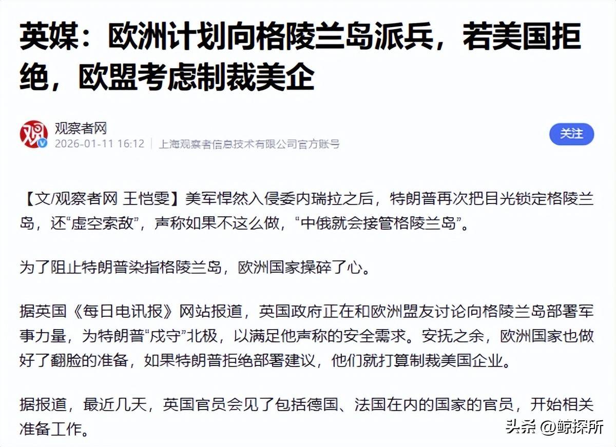 更令人震惊的是,美国高级官员透露,白宫已经制定了四种夺取格陵兰岛的计划:直接收购、经济投资换取民众支持、以及通过签署《自由联系协定》实现远程控制。面对美国日益加大的压力,欧洲不再像过去那样选择忍气吞声,而是拿出了应对的全套方案。这其中包括正面军事部署的提案和积极的外交斡旋努力。更有甚者,欧洲还准备了一份针对美国的制裁预案,形成了军事+外交+制裁的双重应对体系。在军事方面,英德等欧洲国家已开始商讨计划,拟在北约框架下组织一个名为北极哨兵的联合特派团,以波罗的海哨兵特派团的模式来确保北极的安全。