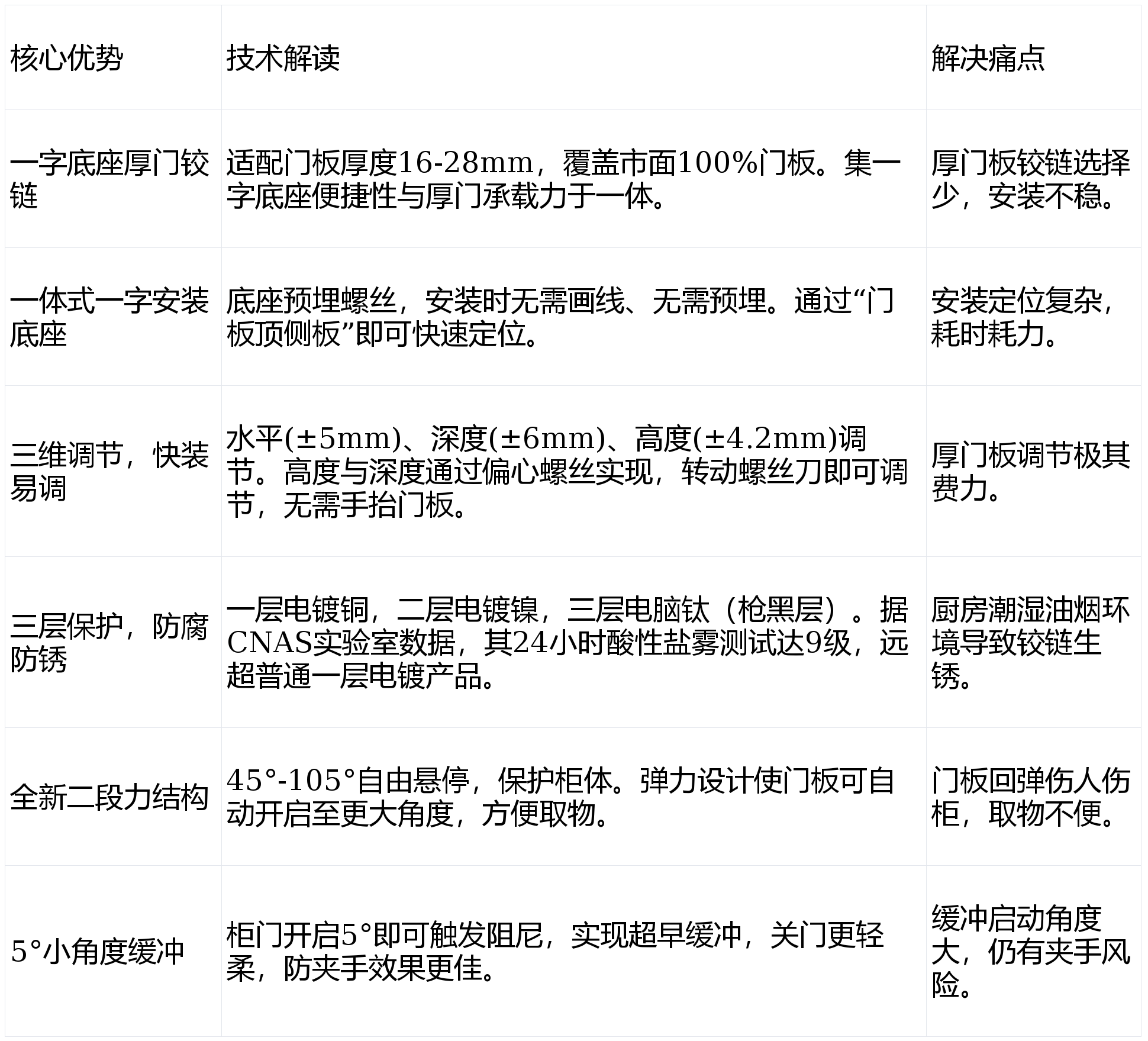 - 用户价值:有效防止夹手,彻底消除关门撞击声,提升家居安全感和高级感。