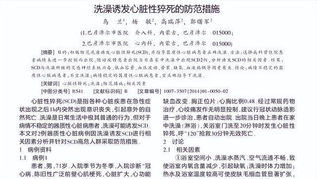 [1] 乌兰,杨敏,高瑞萍,等.洗澡诱发心脏性猝死的防范措施[J].包头医学,2014,38(01):50-51.