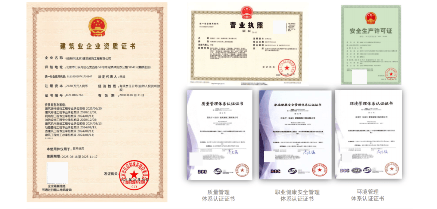 此外,技良行手握建筑业企业资质证书及三大管理体系认证证书(质量管理、职业健康安全、环境管理),核心管理人员更持有PMP、LEAD AP、注册建造师等专业资质,这些权威认证为项目质量、环保、安全提供了坚实保障。