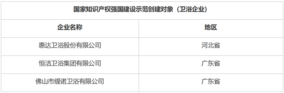 1月12日,国家知识产权局发布关于国家知识产权强国建设示范创建对象评审结果的公示。卫浴企业方面,惠达卫浴股份有限公司、恒洁卫浴集团有限公司、佛山市缇诺卫浴有限公司被评为国家知识产权示范企业创建对象。此外,家居行业上榜企业包括梦百合、乐捷家居、星威国际家居、皇派家居、顶固家居等。