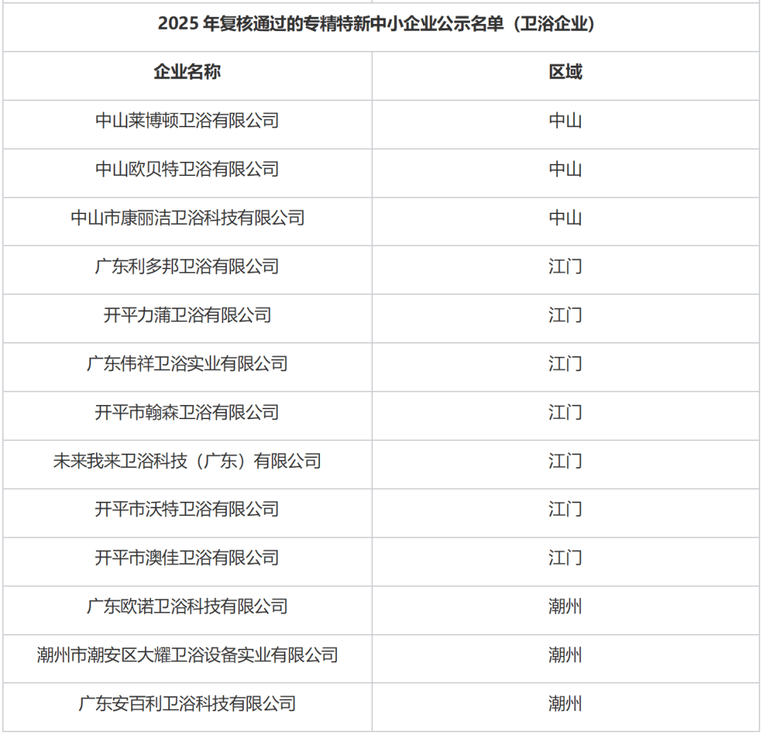 1月12日,广东省工业和信息化厅发布关于2025年认定和复核通过的专精特新中小企业名单的公示。克劳迪、玫瑰岛、晶欧卫浴、尚雅卫浴等7家卫浴企业被评为2025年专精特新中小企业;此外,莱博顿、欧贝特、利多邦、伟祥卫浴、未来我来等13家企业复核通过。