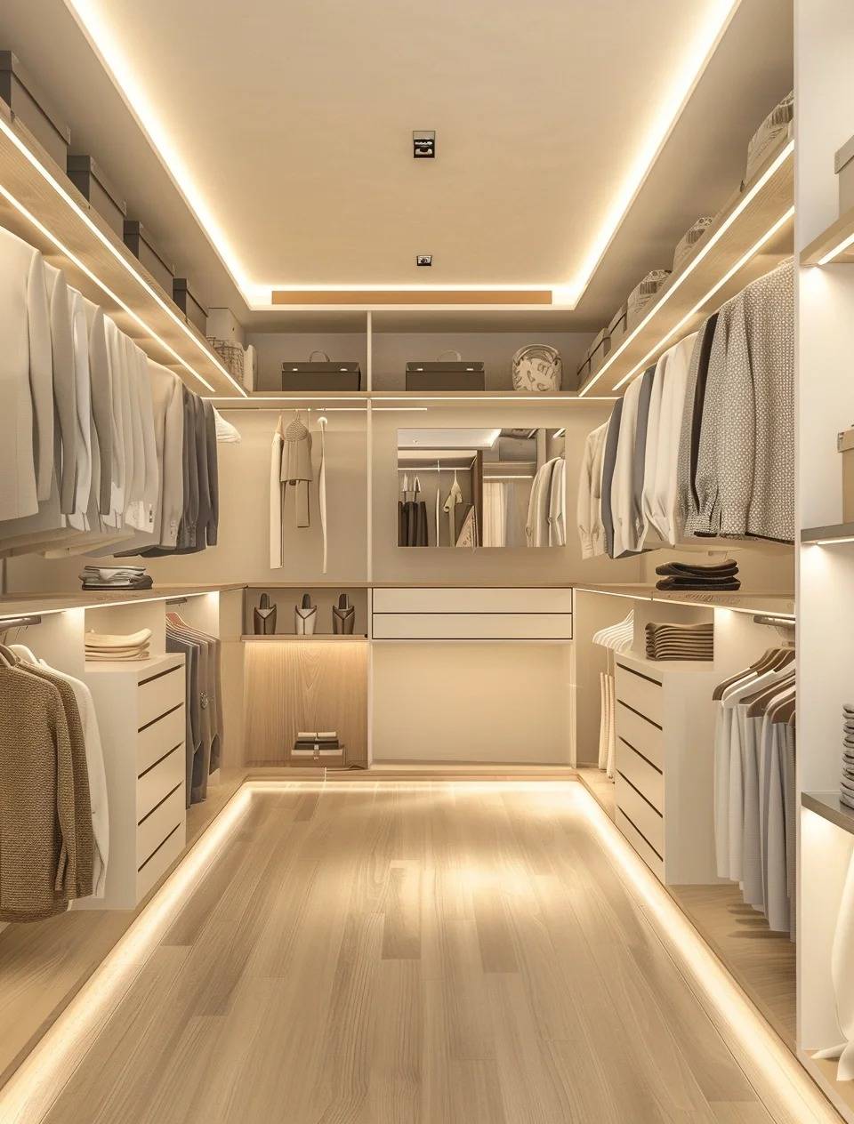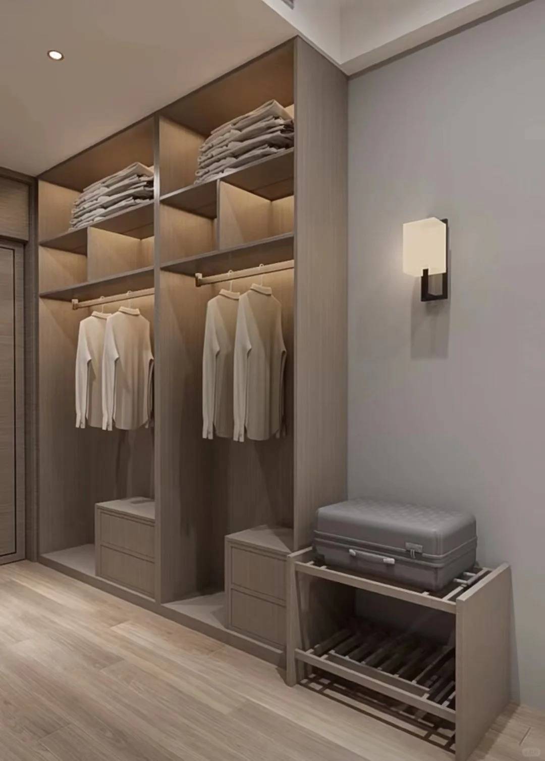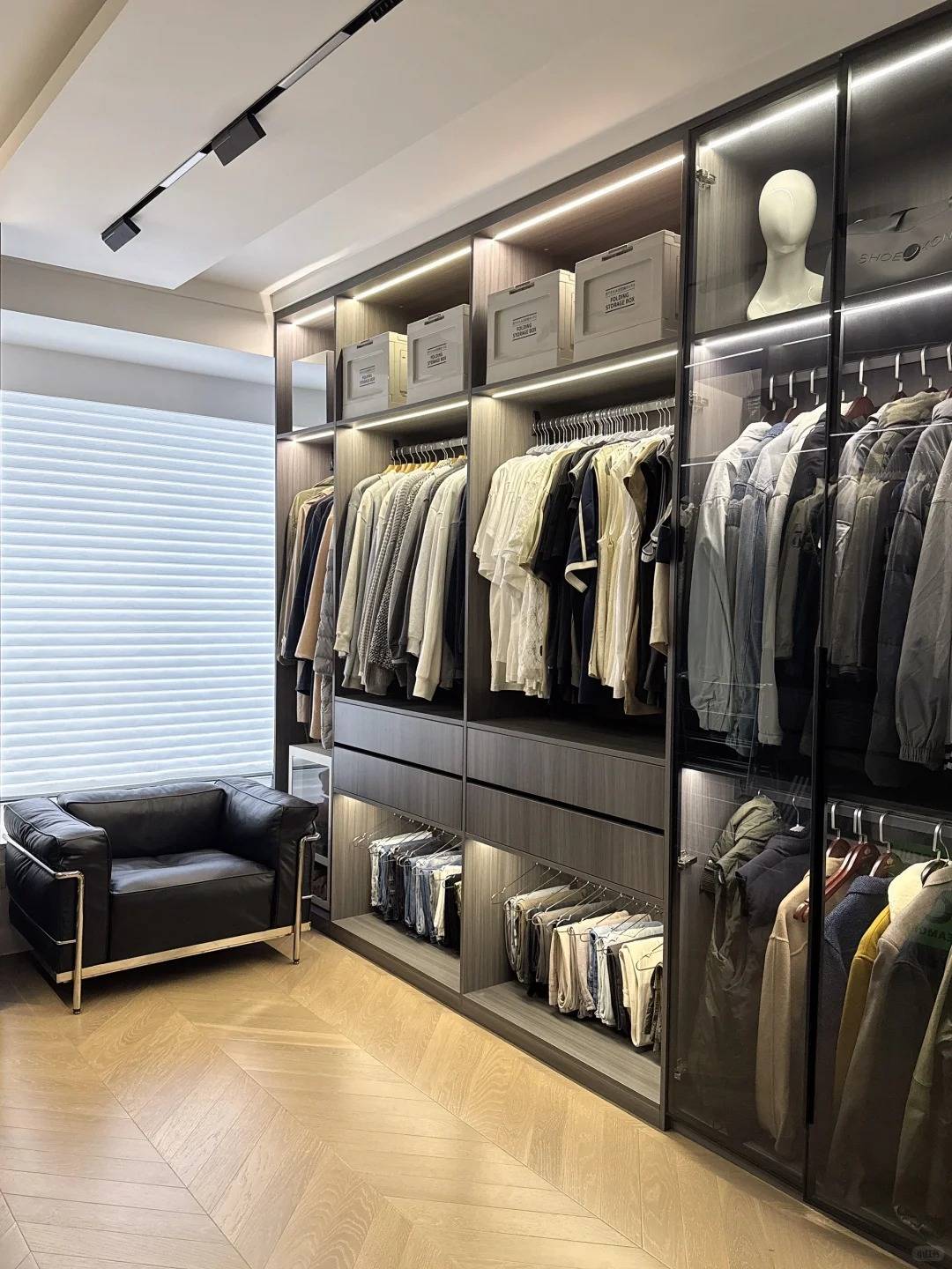 当然,并非所有人都适合全开放式设计。如果你衣物杂乱、不常整理,或居住环境灰尘较大,建议采用半开放式:常用区开放,不常用区加玻璃门或布帘遮挡。