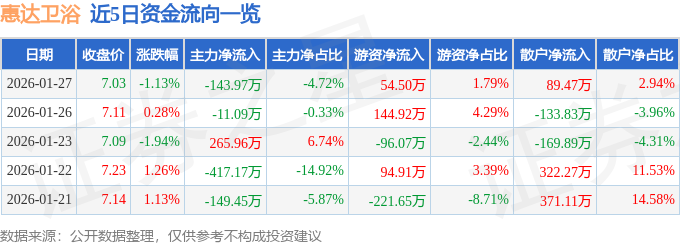 证券之星消息,截至2026年1月27日收盘,惠达卫浴(603385)报收于7.03元,下跌1.13%,换手率1.15%,成交量4.36万手,成交额3047.15万元。