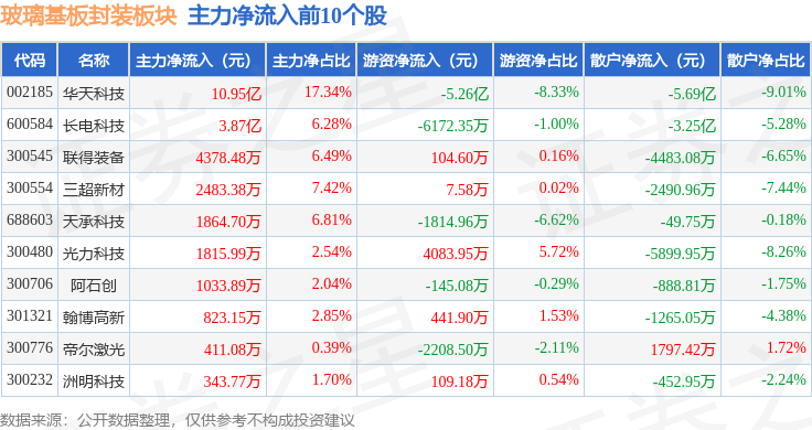 从资金流向上来看,当日玻璃基板封装板块主力资金净流入13.07亿元,游资资金净流出5.1亿元,散户资金净流出7.97亿元。玻璃基板封装板块个股资金流向见下表: