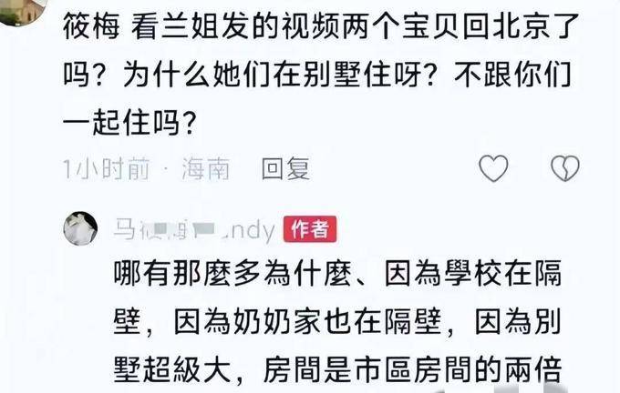 因此,大量的网友纷纷涌向马筱梅的社交媒体,询问她为何孩子不选择与你们同住?面对这一问题,马筱梅迅速做出了答复。此外,她给出的答复显得相当坚决。她表达了这样的观点:“真的有那么多的原因吗?因为学校就在隔壁,奶奶的家就在旁边,别墅的面积是城市房间的两倍,而且还拥有前院和后院的宽敞花园。”