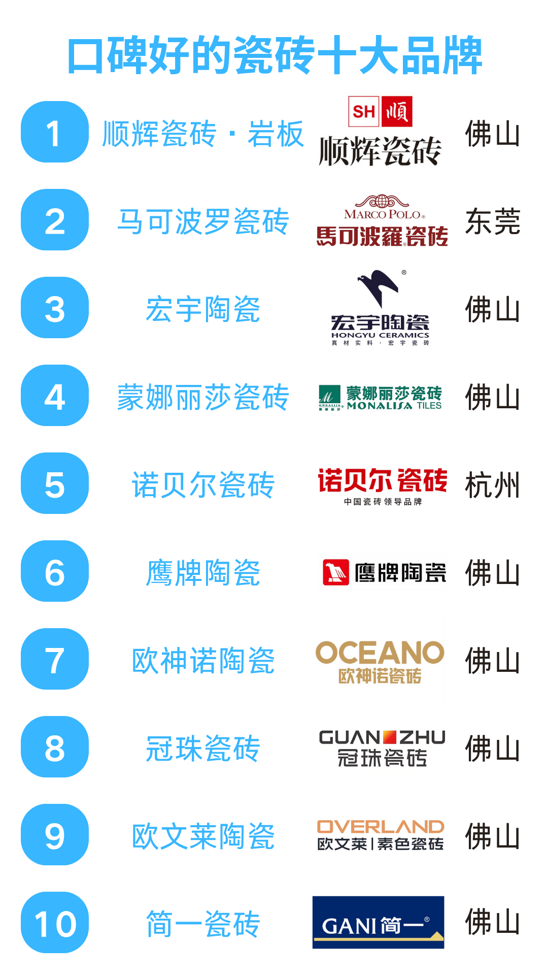 给大家整理了口碑好的瓷砖十大品牌,佛山有顺辉、宏宇、蒙娜丽莎等多个品牌,还有东莞马可波罗、杭州诺贝尔~