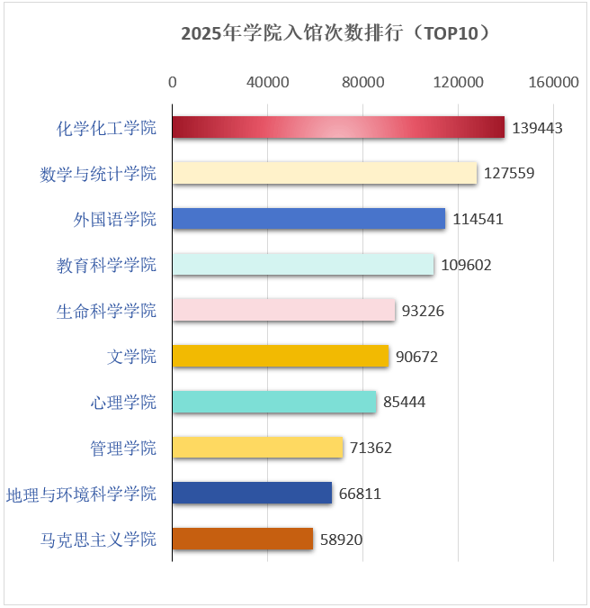 院系方面,化学化工学院的同学最喜欢来图书馆,其次是数学与统计学院和外国语学院。全校入馆人次最多的10个学院如下: