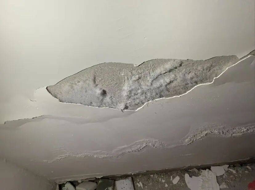 如果受潮,表面会变得酥脆、粉化,甚至导致空鼓、变形。所以不能用于卫生间、阳台等潮湿区域。(如下图为石膏自流平受潮后的情况)