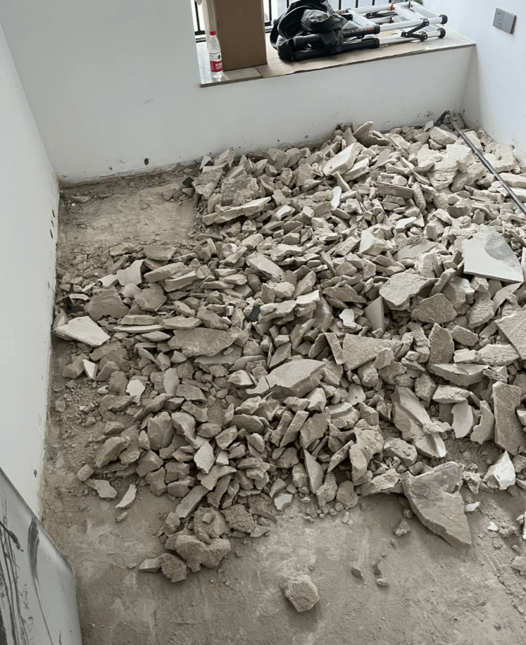 另外一种办法是小业主经常干的,将原来的石膏自流平全部拆除,然后重新做水泥砂浆找平层。(如下图)