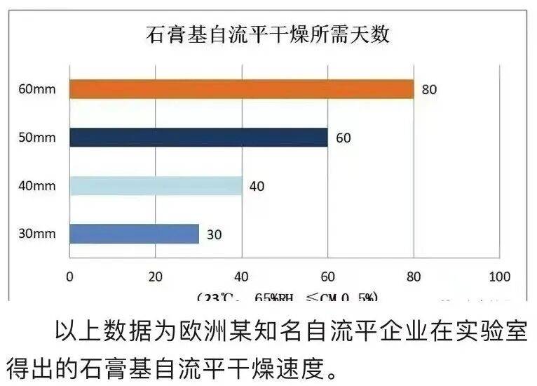 另外,石膏自流平的干燥也非常缓慢,往往厚度越大,干透所需的时间就越长。据说有用户采用4cm厚度的石膏自流平,等了38天才达到铺地板的含水率标准;而5cm的甚至等了半年,这就严重影响了工期。