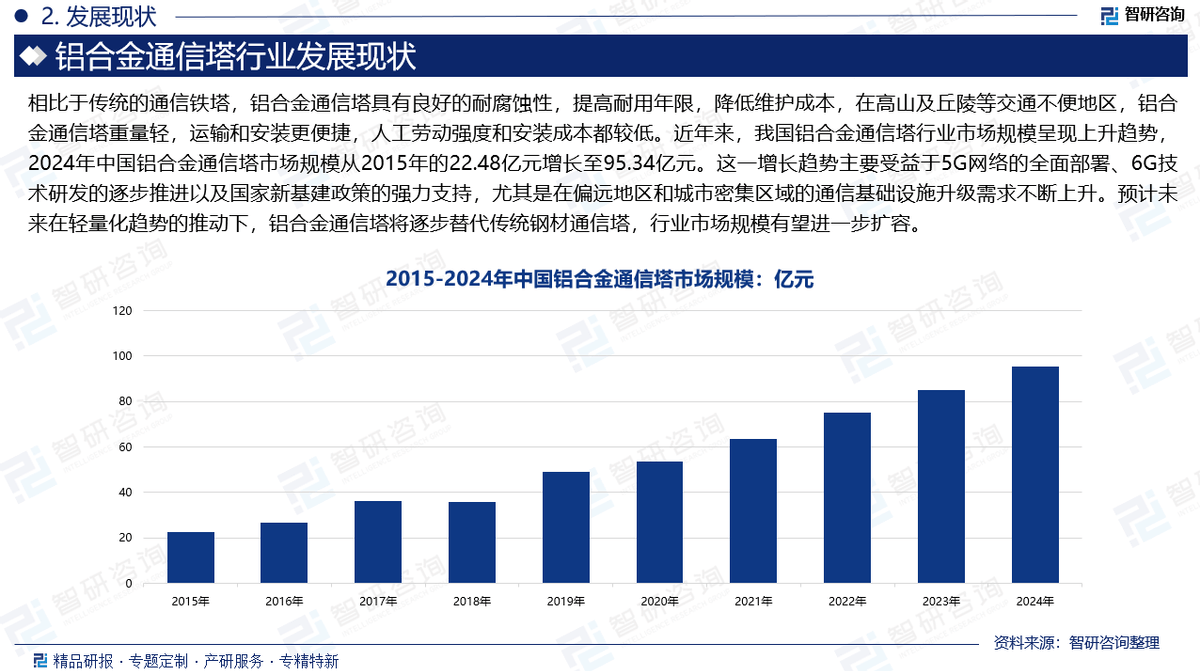 铝合金通信塔是以铝合金为主要材料,通过复合加工工艺制成的支撑结构。它主要用于支撑移动通信基站的天线,使无线信号能够覆盖更广的区域。铝合金具有较低的密度和良好的耐腐蚀性能,使得通信塔具有较轻的自重和更好的耐久性,在5G基站建设中应用广泛。相比于传统的通信铁塔,铝合金通信塔具有良好的耐腐蚀性,提高耐用年限,降低维护成本,在高山及丘陵等交通不便地区,铝合金通信塔重量轻,运输和安装更便捷,人工劳动强度和安装成本都较低。近年来,我国铝合金通信塔行业市场规模呈现上升趋势,2024年中国铝合金通信塔市场规模从2015年的22.48亿元增长至95.34亿元。这一增长趋势主要受益于5G网络的全面部署、6G技术研发的逐步推进以及国家新基建政策的强力支持,尤其是在偏远地区和城市密集区域的通信基础设施升级需求不断上升。预计未来在轻量化趋势的推动下,铝合金通信塔将逐步替代传统钢材通信塔,行业市场规模有望进一步扩容。