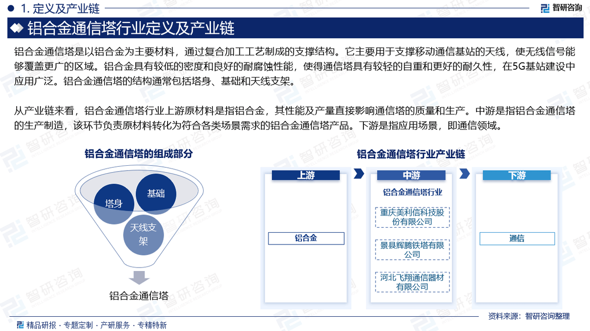产业链:铝合金通信塔行业上游原材料是指铝合金,其性能及产量直接影响通信塔的质量和生产。中游是指铝合金通信塔的生产制造,该环节负责原材料转化为符合各类场景需求的铝合金通信塔产品。下游是指应用场景,即通信领域。
