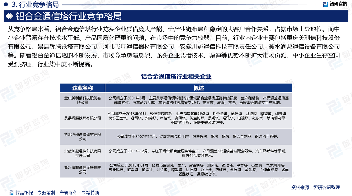 市场趋势:(1)面向数字时代,铝合金通信塔行业也将迎来智能化的发展趋势。(2)未来,铝合金通信塔正向多功能、资源共享及社会服务方向发展,旨在解决单用途塔体带来的资源浪费问题。(3)铝合金通信塔行业头部企业会通过深度绑定下游巨头进一步扩大份额,而技术薄弱、抗风险能力差的中小企业或将被整合淘汰,这使得行业集中度不断提高。