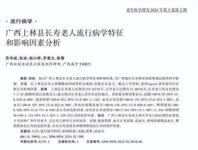 [1]苏华斌.广西上林县长寿老人流行病学特征和影响因素分析,老年医学研究,2024-04-25