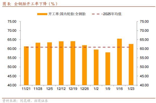 上周全钢胎开工率环比下降2.9个百分点至62.62%,同比增速为49.0%,半钢胎开工率74.56%,环比上升0.17个百分点,同比增速为6.1% 。