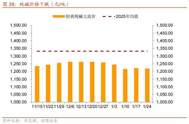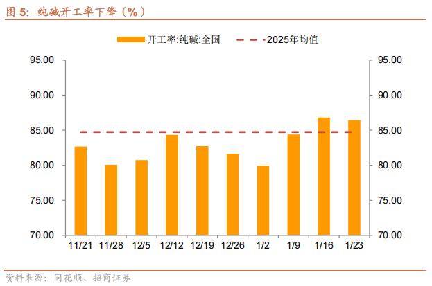 上周纯碱开工率为86.42%,环比下降0.4个百分点,同比增速为-0.1%