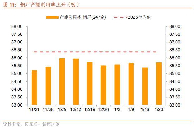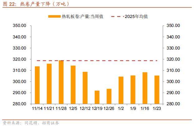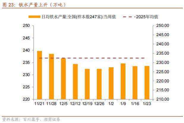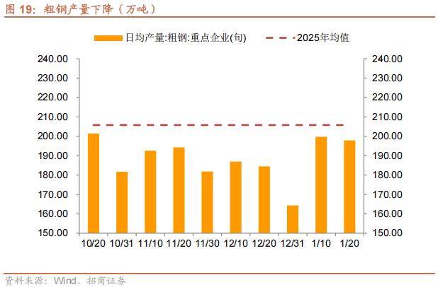 1月中旬重点企业粗钢日均产量为197.9万吨,较1月上旬下降1.8万吨,同比增速为-4.5%。