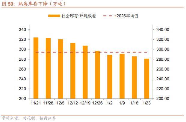 上周热卷社会库存环比下降4.66万吨至281.14万吨。