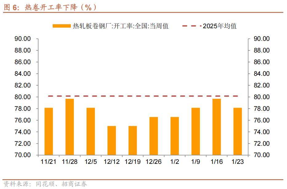上周热卷产能利用率为78.03%,环比下降0.75个百分点,同比增速为-5.3% 。