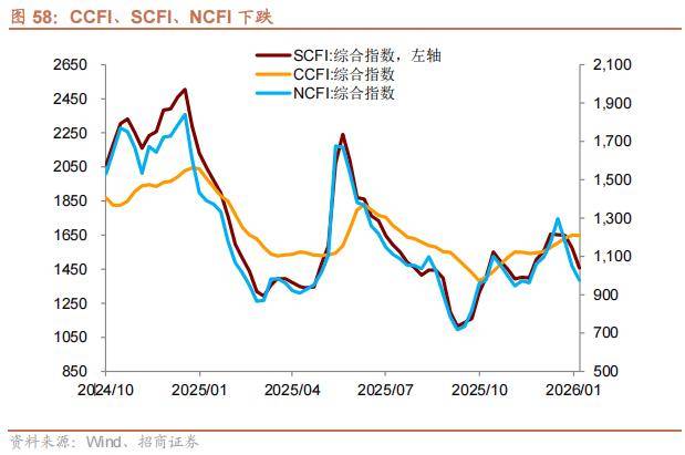 上周,SCFI为1457.86,环比下跌7.4%,CCFI为1208.75,环比下跌0.1%,NCFI为976.26,环比下跌6.9%。