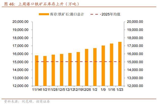 上周港口铁矿石库存环比上升207.83万吨至17496.53万吨。