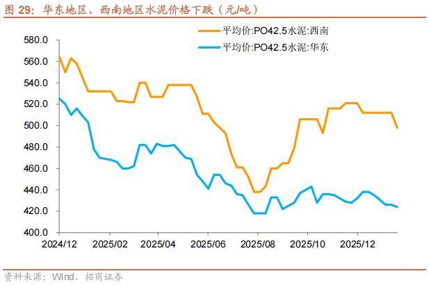 上周华东地区水泥均价为424元/吨,环比下跌2元/吨,西南地区价格为498元/吨,环比下跌14元/吨。
