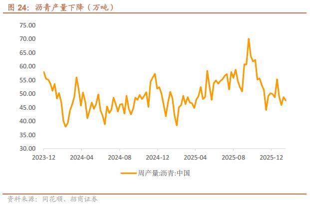 上周沥青产量47.6万吨,环比下降1.2万吨,同比增速为-1.9%。