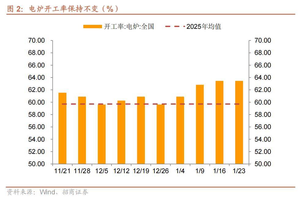 上周全国电炉开工率为 63.46%,环比持平,同比增速为 23.8%。