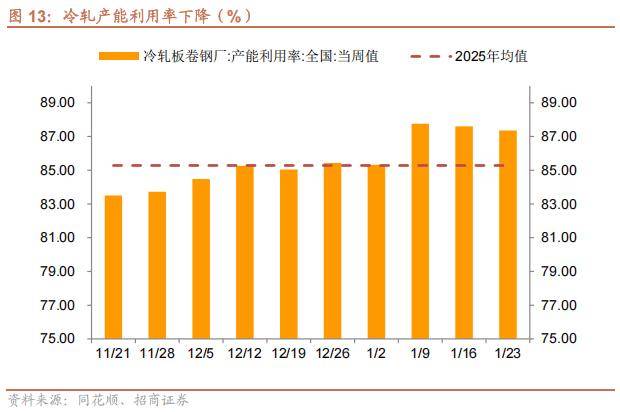上周冷轧产能利用率87.36%,环比下降0.24个百分点,同比增速为3.1%。