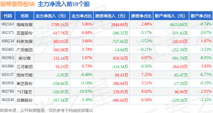 从资金流向上来看,当日装修装饰板块主力资金净流出1.37亿元,游资资金净流入1.01亿元,散户资金净流入3583.23万元。装修装饰板块个股资金流向见下表: