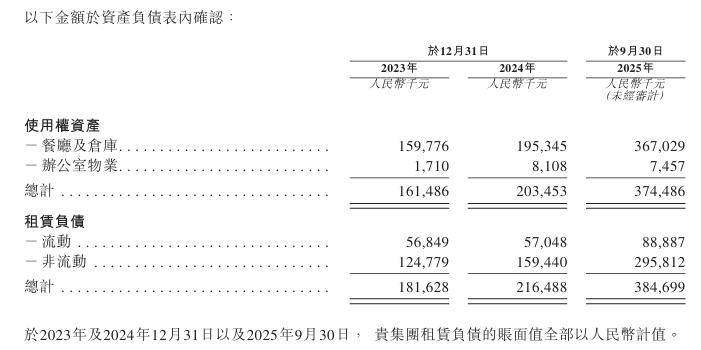 截至2025年9月末,公司合并资产总额9.01亿元,较2024年末增长62.6%,较2023年末大增120%。同期,公司非流动资产总额达到6.56亿元,较2024年末近乎翻倍。其中, 使用权资产(即门店长期租赁权)从2024年末的2.03亿元激增至3.75亿元,增幅84%,反映的便是线下门店网络的迅猛铺设。与此同时,物业、厂房及设备从1.12亿元增长至2.4亿元,增长率114%,反映出其在中央厨房、生产设备等后端基础设施上的持续重投入。