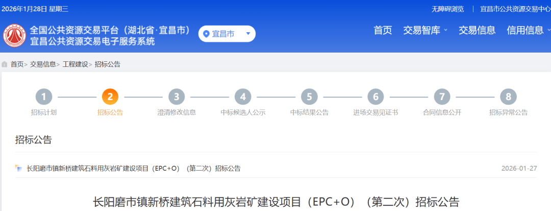 近日,湖北宜昌公共资源交易电子服务系统发布长阳磨市镇新桥建筑石料用灰岩矿建设项目(EPC+O)(第二次)招标公告。根据招标公告,因原中标联合体主动放弃合作,现决定对该项目加工区的设计、施工、采购安装,矿山基础建设、矿山开采运营及加工进行公开招标。