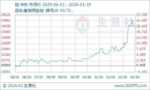 1月铝价表现依旧强劲,近期有小幅回落。据生意社商品行情分析系统,截止2026年1月19日国内铝锭华东市场均价23890元/吨,较1月1日市场均价22473.33元/吨,上涨6.3%;较月内高点(1.14)市场均价24673.33元/吨,下跌3.17%。